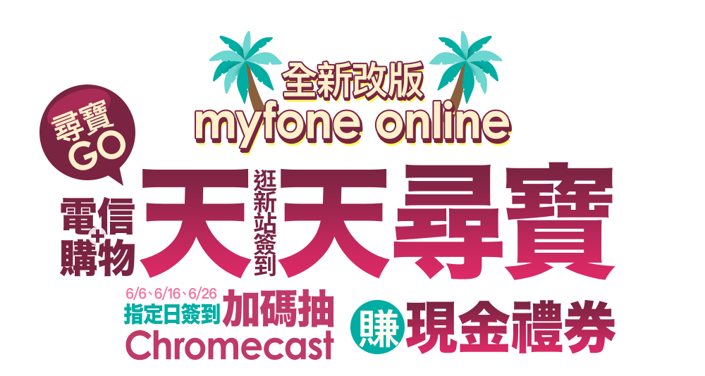 - 活動期間於活動網頁登入進行簽到,即可抽$1~$888myfone online贈品電子禮券;於指定日6/6、6/16、6/26,當日進行簽到加碼抽Google Chromecast(市價: 1,999)各1名。