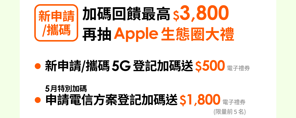 - 新申請(含攜碼) 5G專案,登記送 $500 (myfone online電子禮券)。