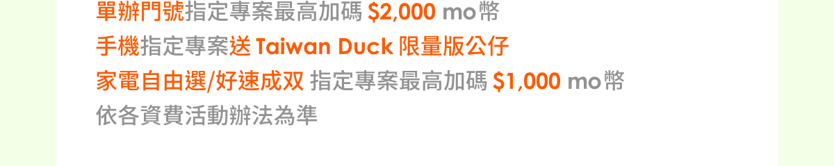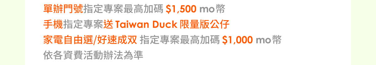 - 指定專案最高加碼$2,000 mo幣,依各資費活動辦法為準。
