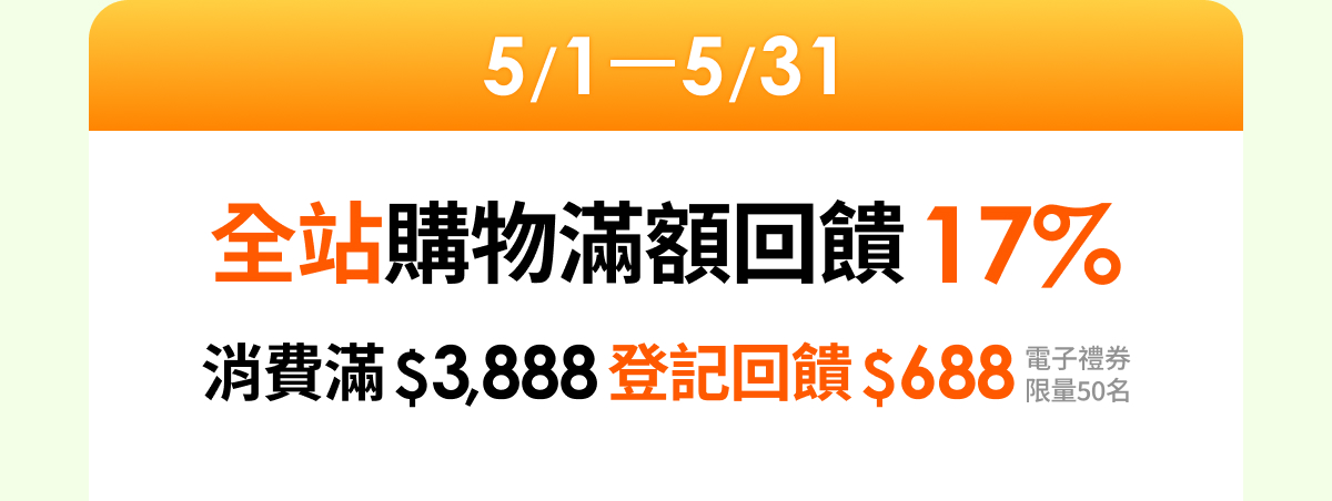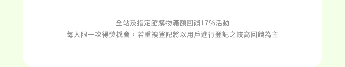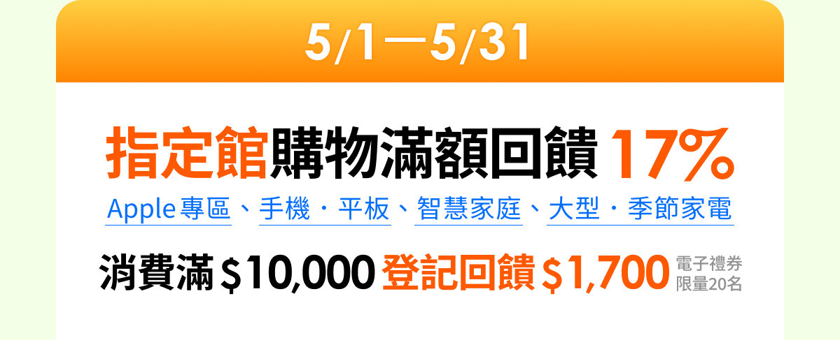 - 活動期間於活動通路累計購物消費達指定金額(下稱登記指定門檻,詳見獎項說明),且於指定登記時間內完成登記,即可參與電子禮券回饋(最高回饋17%,係以登記指定門檻計算)之活動,逾期登記視為放棄,活動期間內每人限得一次得獎機會,不得重複登記獲獎(若重複登記將以用戶進行登記之較高回饋為主,與4月全站綁約/購物滿額活動擇優回饋,且不得疊加新申請或攜碼5G回饋$500活動)。