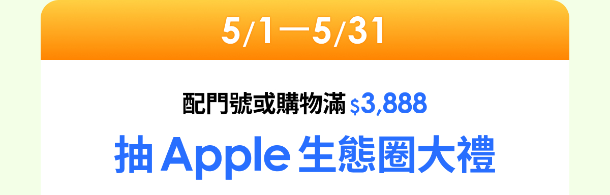 - 活動期間於活動通路累計購物消費達$3888,且於指定登記時間內完成登記,即可參與電子禮券回饋活動,逾期登記視為放棄,活動期間內每人限得一次得獎機會,不得重複登記獲獎(若同時登記4月全站綁約/購物滿額活動擇優回饋,且不得疊加新申請或攜碼5G回饋$500活動)。
