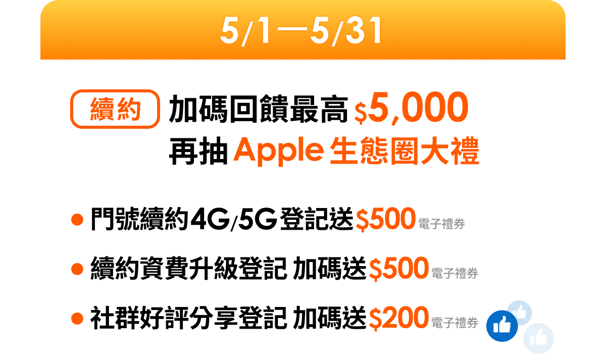 - 申請4G/5G專案,續約且於社群好評分享,登記加碼再送 $200 (myfone online電子禮券)。