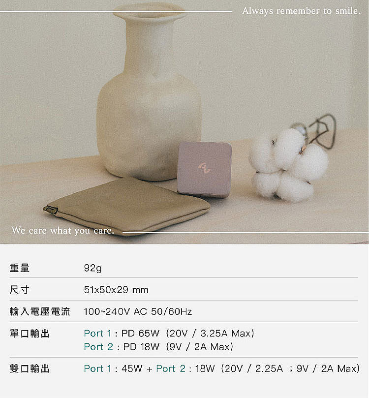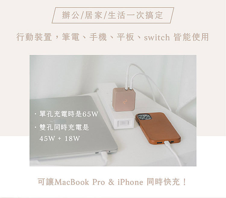想要讓 iPhone、iPad 可以「快充」,使用 USB-C 充電線是唯一方式,雙孔的好處就是可以同時幫 iPhone 和 iPad 達到快充。最大輸出 65W