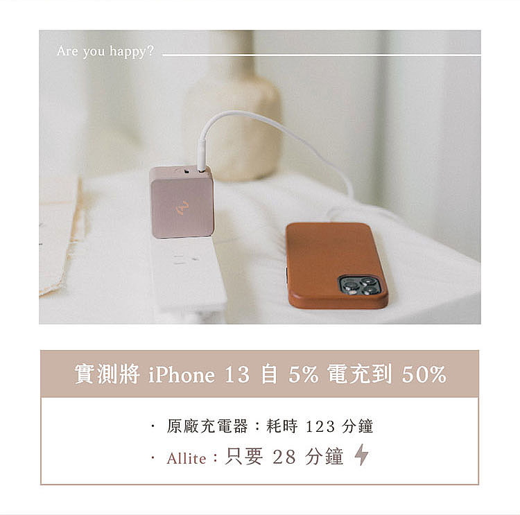 使用 iphone 11 進行實測,相較於原廠充電器,Allite 足足減少了將近兩小時的充電時間!實測將 iphone 11 自 5% 電充到 50%