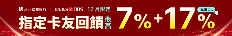 活動說明:活動期間持富邦銀行、星展銀行信用卡刷卡累積消費滿11,000元,即可參與登記回饋,於2025/12/31 00:00開放登記,最後登記時間為2026/1/5 23:59,逾期視為放棄,於登記時間結束前完成登記之前50名始具得獎資格,一人限一次得獎機會,不得重複領獎。