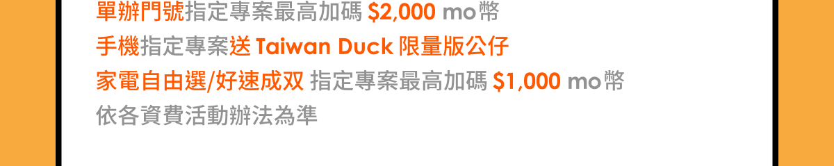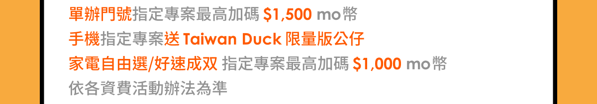 - 指定專案最高加碼$2,000 mo幣,依各資費活動辦法為準。