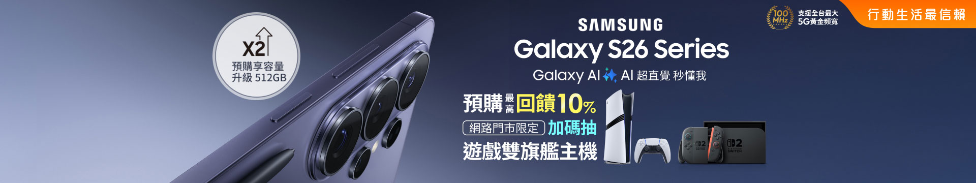 台灣大哥大即日起開放預購全新Samsung Galaxy S26旗艦系列,加碼回饋星粉,預購享256GB容量升級512GB;搭配台灣大指定專案0元帶走,加碼電信獨家抽三星第2代 The Freestyle 微型智慧投影機。 [...]