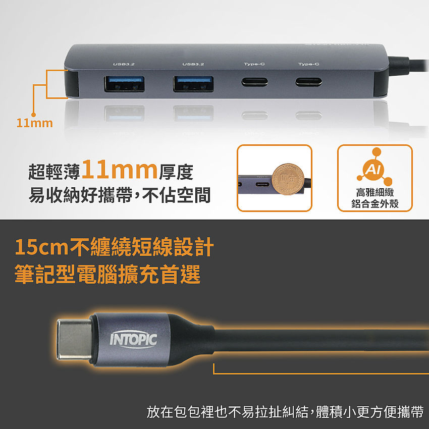雙介面輸入,USB埠可單獨使用,也可以和Type C埠插在一起使用