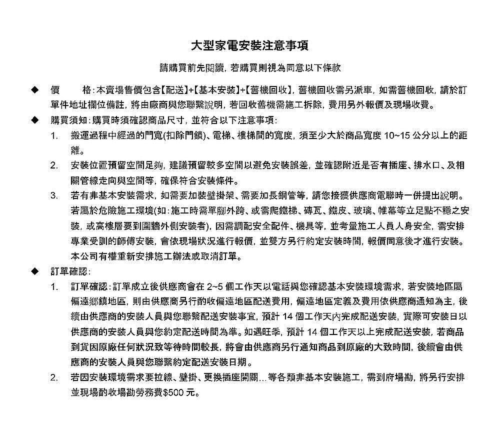 9. 大型家電辦理退換貨,若非新品瑕疵,因商品一經安裝、運轉即無法回復完整新品,將會有整新費及運費等相關費用,敬請注意。