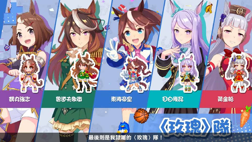 化身點陣風格的賽馬娘們將組成五人小隊,以風格截然不同的四支隊伍共同挑戰「喧鬧GP(大獎賽)」。