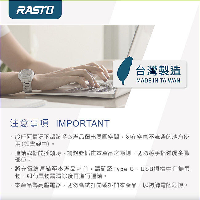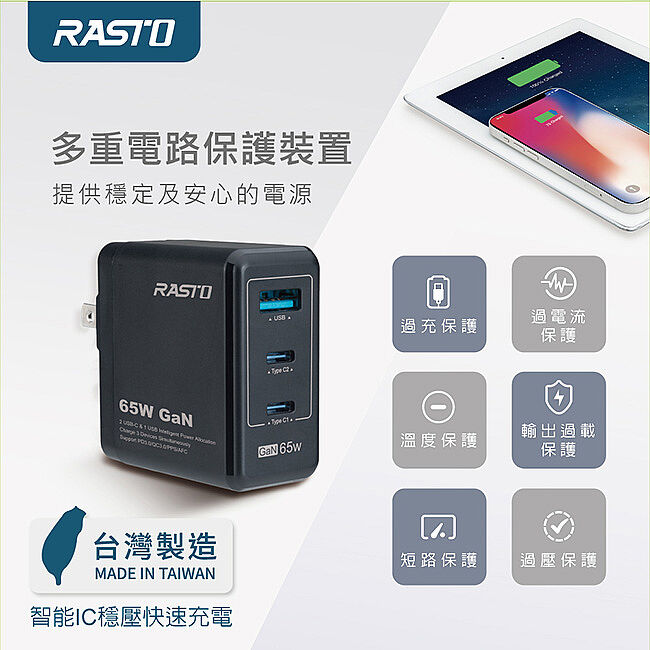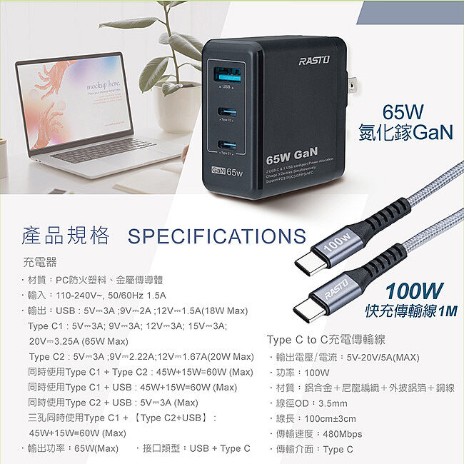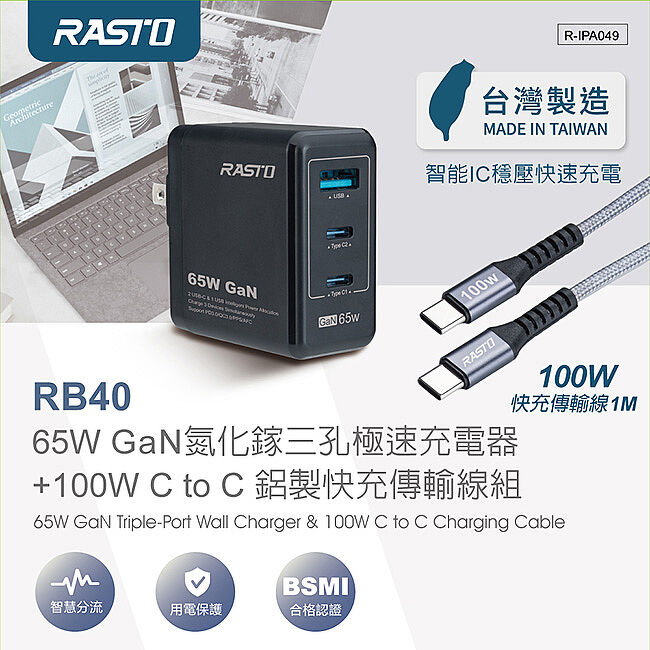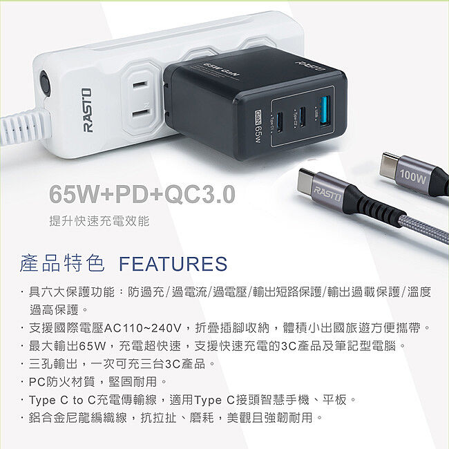 RASTO RB40 65W GaN氮化鎵三孔極速充電器 + 100W C to C 鋁製快充傳輸線組