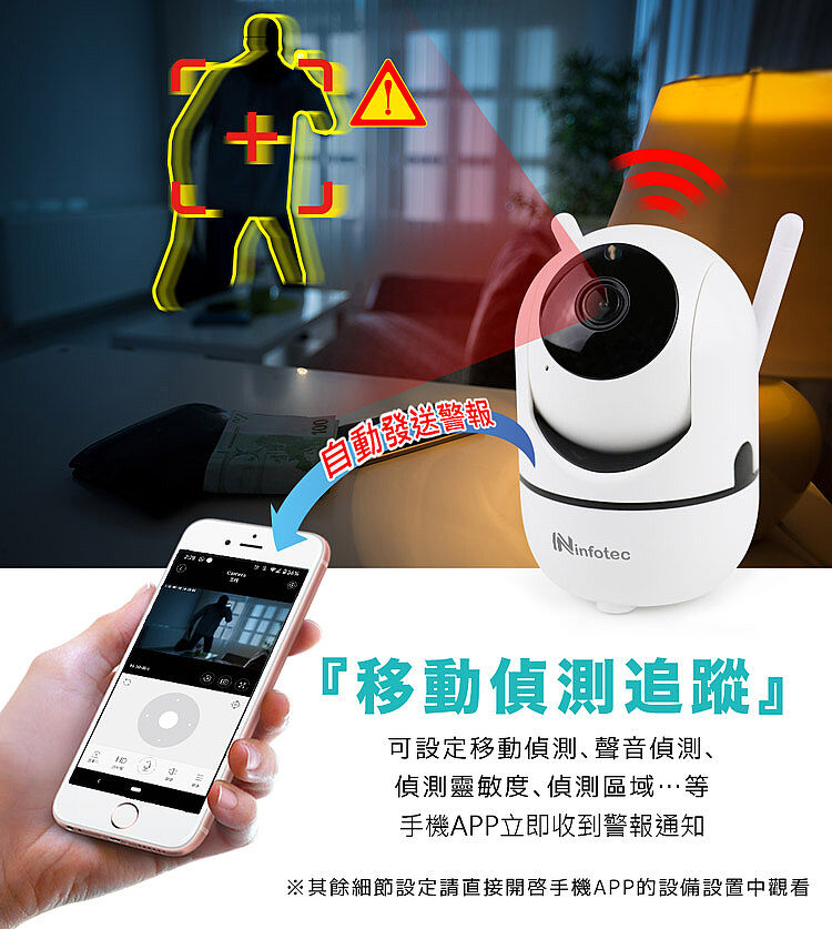 當無人在家時一旦發生入侵事件,畫面中偵測到有物品移動或是網路攝影機被碰撞時