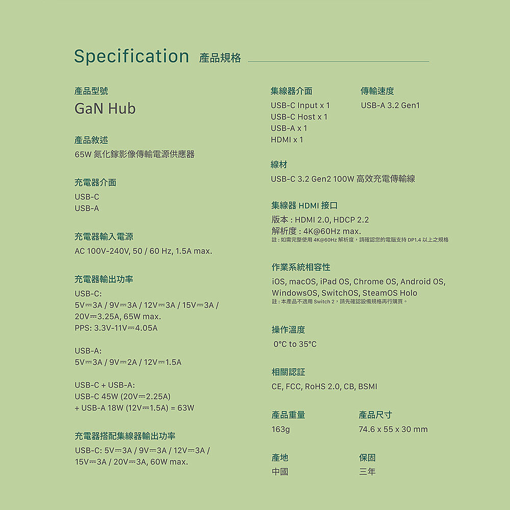 【65W GaN 快充】應用氮化鎵快充技術,支援PD3.0 65W充電。單獨使用充電器 USB-C 單孔可輸出最高65W;兩孔同時充電時,USB-C支援最高45W,USB-A支援最高18W。結合集線器時,USB-C 最高可支援 60W 充電速度,USB-A 孔為資料傳輸使用,支援 5Gbps 資料傳輸速度。