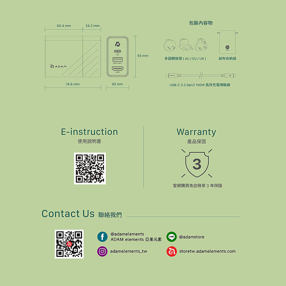 【支援電壓100-240V】隨附英規、歐規、澳規旅用轉接頭,支援全球超過150個國家使用。