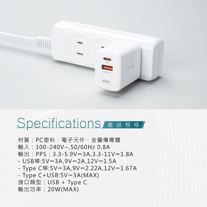 E-books B111 智能穩壓 20W PD+QC3.0雙孔快速充電器