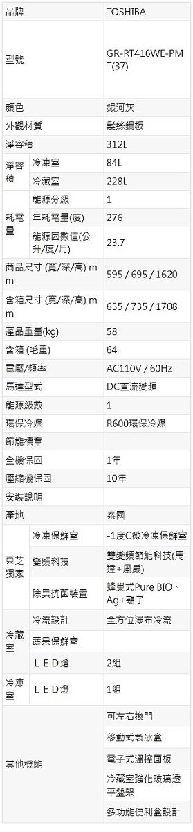 TOSHIBA 東芝 312L原味覺醒精品系列變頻冰箱 GR-RT416WE-PMT