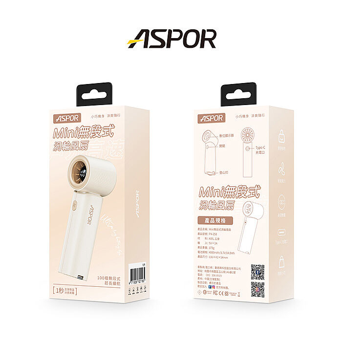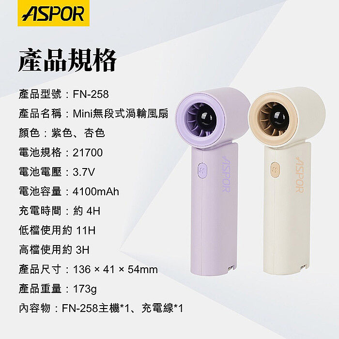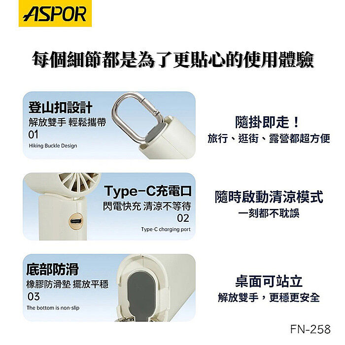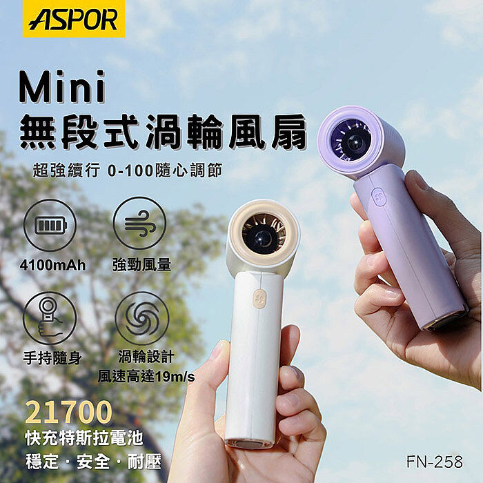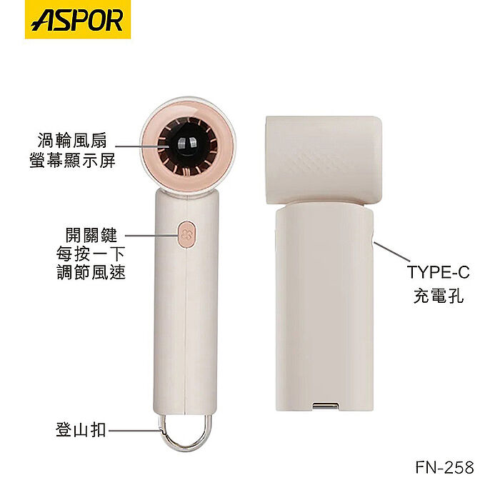 ASPOR Mini無段式渦輪風扇(手持式/登山扣/大容量電池/超長續航力)