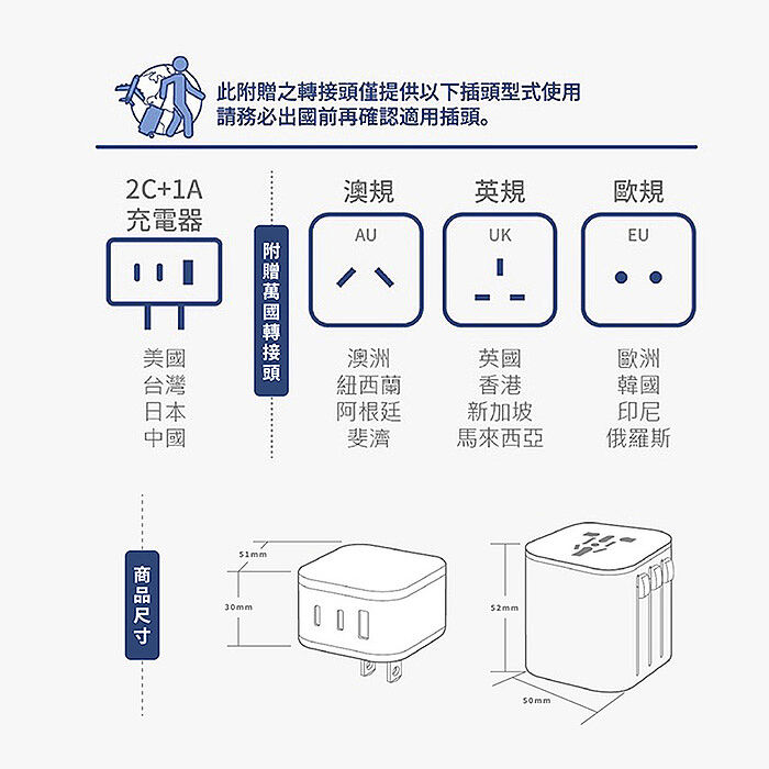 尺寸:充電器:51x50x30mm(不含插腳)/ 轉接頭:51x52x50mm(不含插腳)