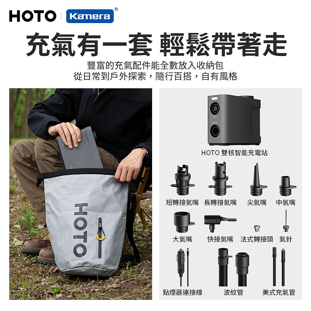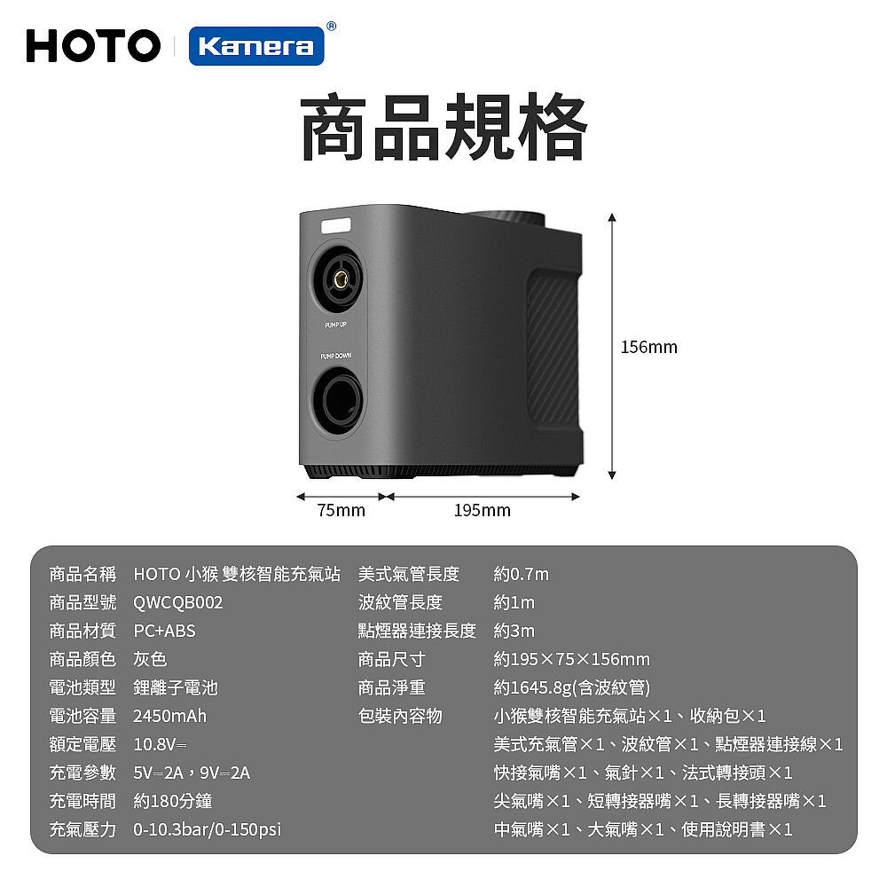 包裝內容:小猴雙核智能充氣站×1、收納包×1、美式充氣管×1、波紋管×1、點煙器連接線×1、快接氣嘴×1、氣針×1、法式轉接頭×1、尖氣嘴×1、短轉接器嘴×1、長轉接器嘴×1、中氣嘴×1、大氣嘴×1、使用說明書×1