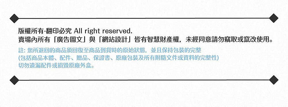 (含外包裝、配件等;產品一經註冊可能需要另外酌收額外的費用),且下單即視同同意上述條款,敬請再次確認,不便之處敬請見諒謝謝。》