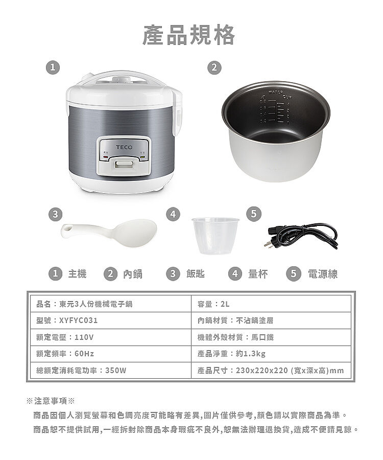 商品名稱:東元3人份機械電子鍋XYFYC031