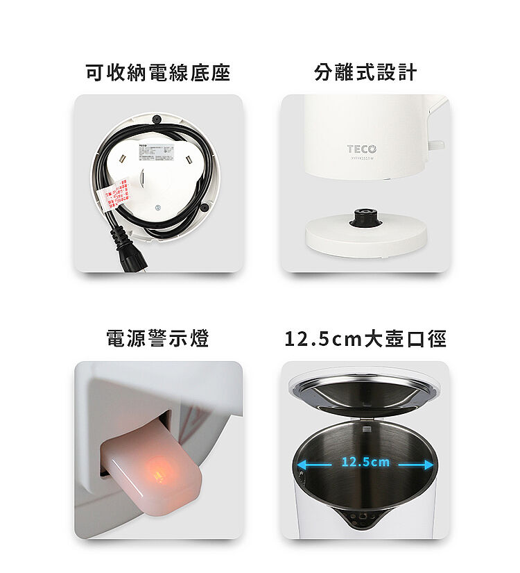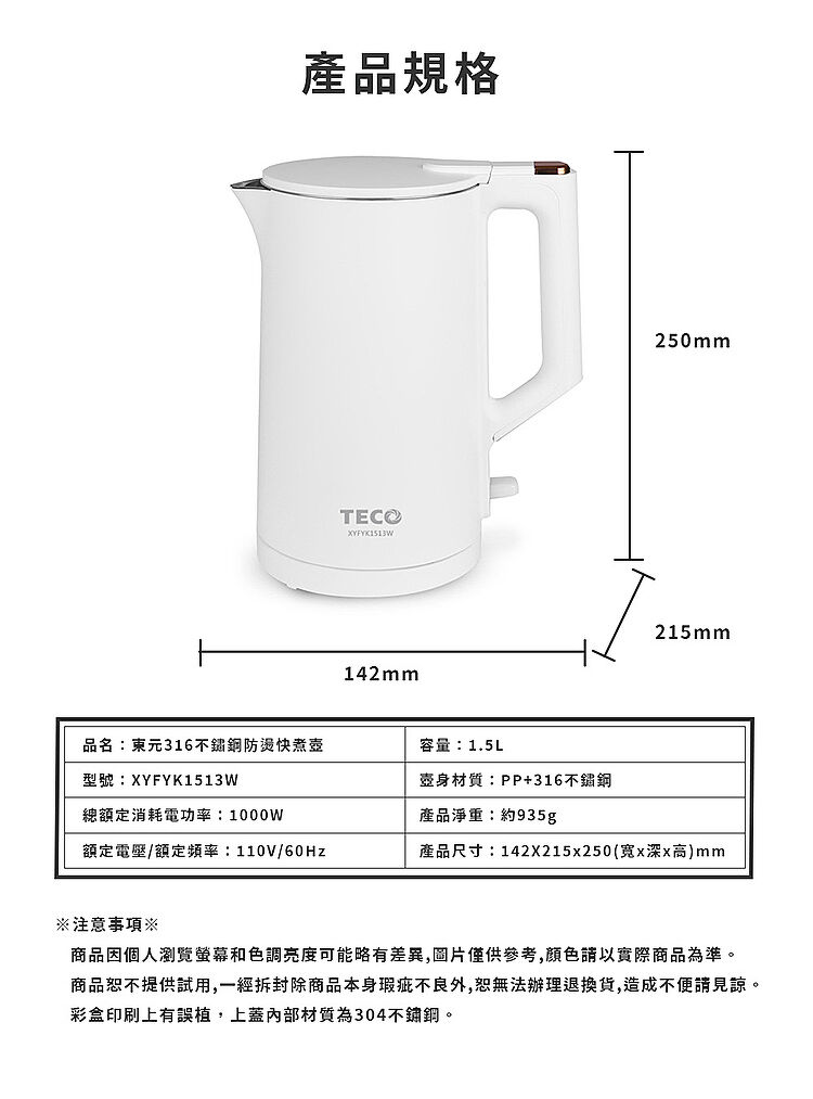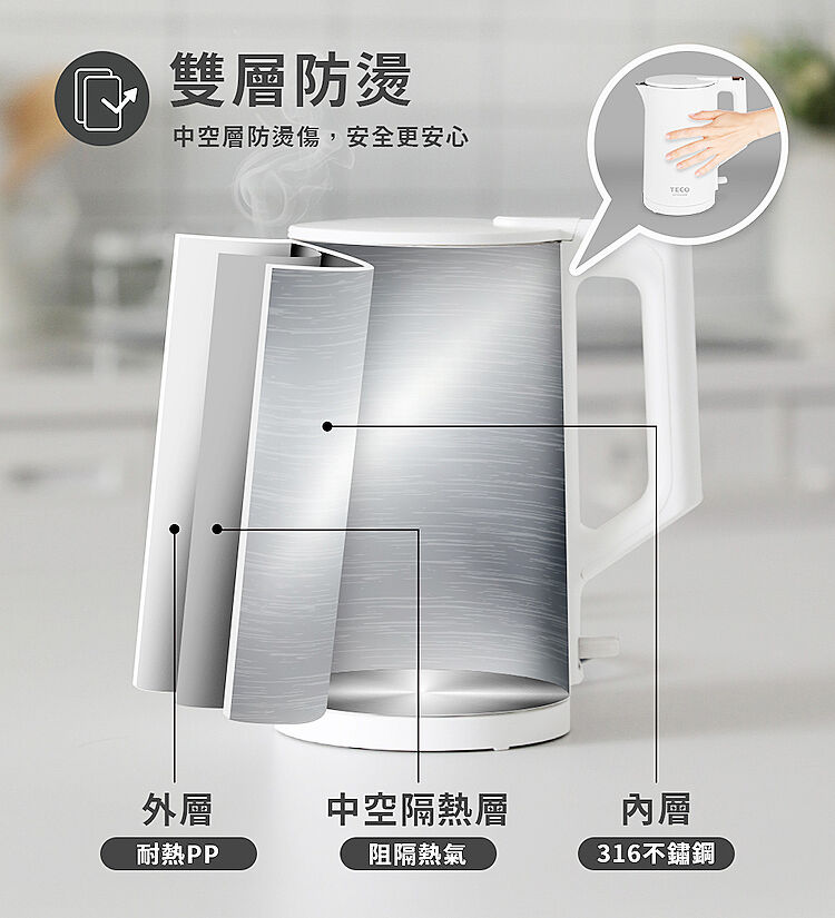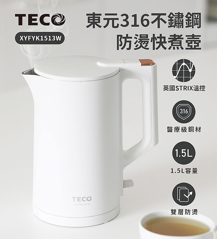 商品名稱:東元316不鏽鋼雙層防燙快煮壺XYFYK1513W
