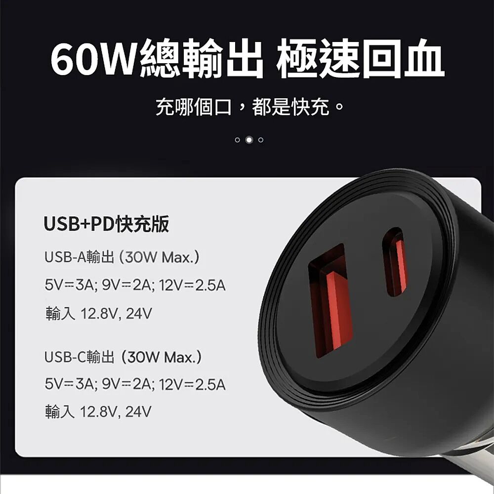 USB-A + USB-C : 12V 2.5A + 12V 2.5A (60W MAX) (輸入12.8V)
