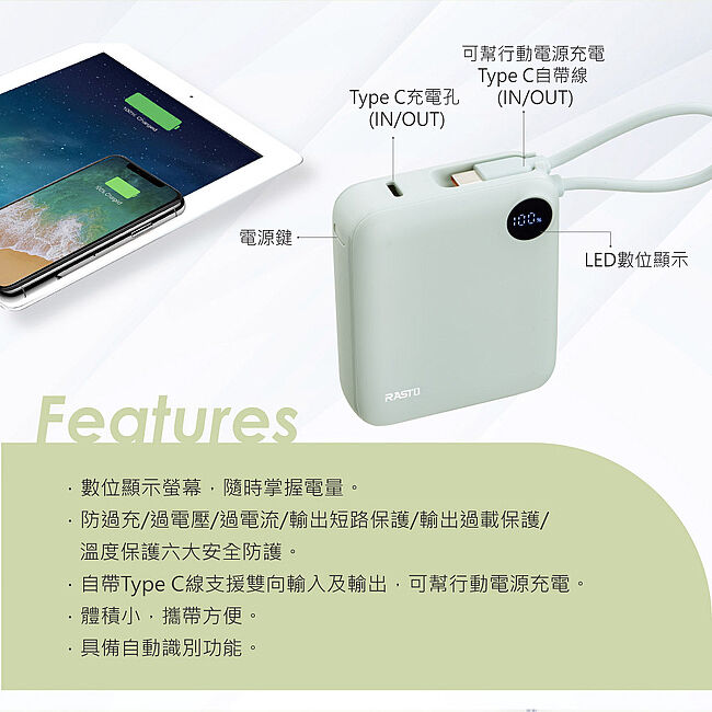 RASTO RB55 【台灣製造】10000mAh數顯自帶線二輸出雙向快充行動電源