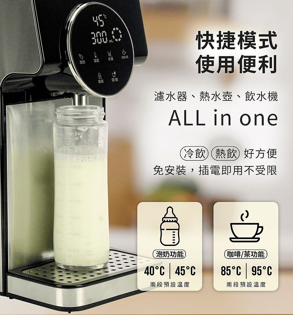 A:奶粉模式如不符需求,可使用<手動模式>的連續出水(水量顯示000),選擇需求水溫 後即可自行調配水量沖泡。