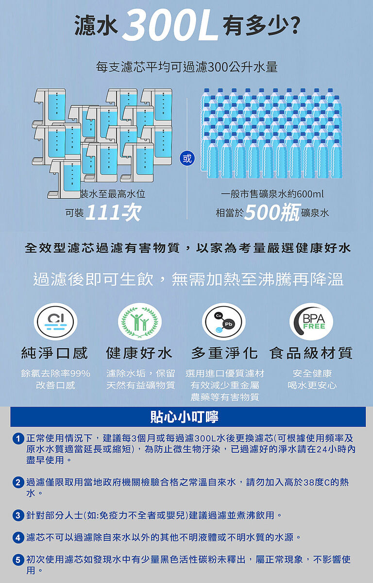 長效型濾芯,一支濾芯有效濾水量高達300公升,約使用3個月才需更換。