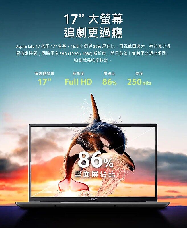 螢幕:17.3" FHD (1920X1080) IPS/NTSC 45%/250 nits
