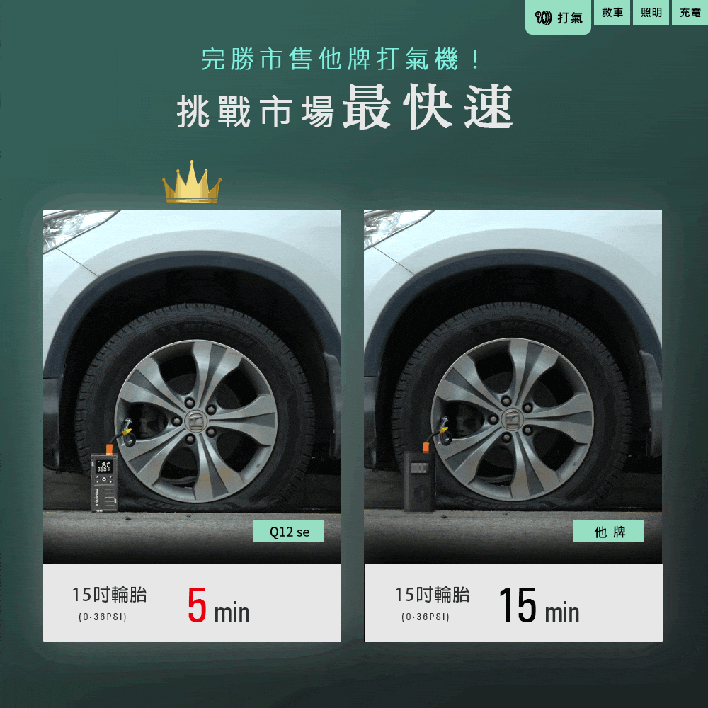 • 充氣速度:汽車輪胎(205/55/R16) 0~36PSI約5分鐘
