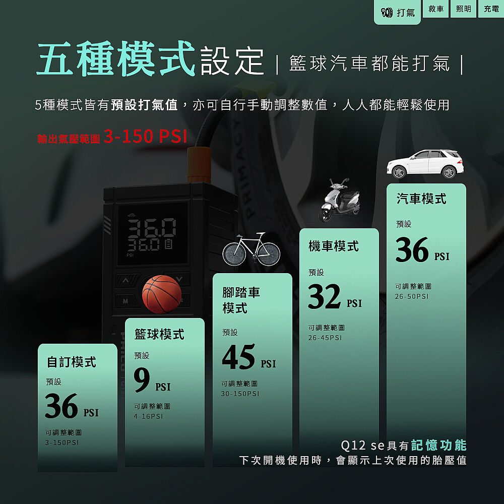 ●五種預設模式,汽車/機車/腳踏車/籃球/自訂,最高可設置150PSI