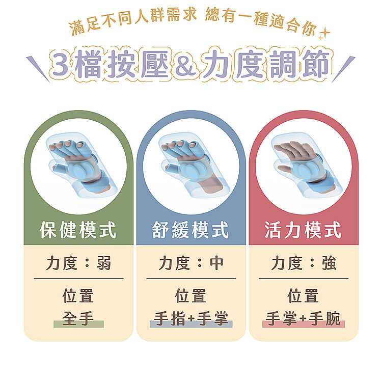 三檔模式:保健模式(全手),活力模式(手掌+手腕),舒緩模式(手掌+手指)