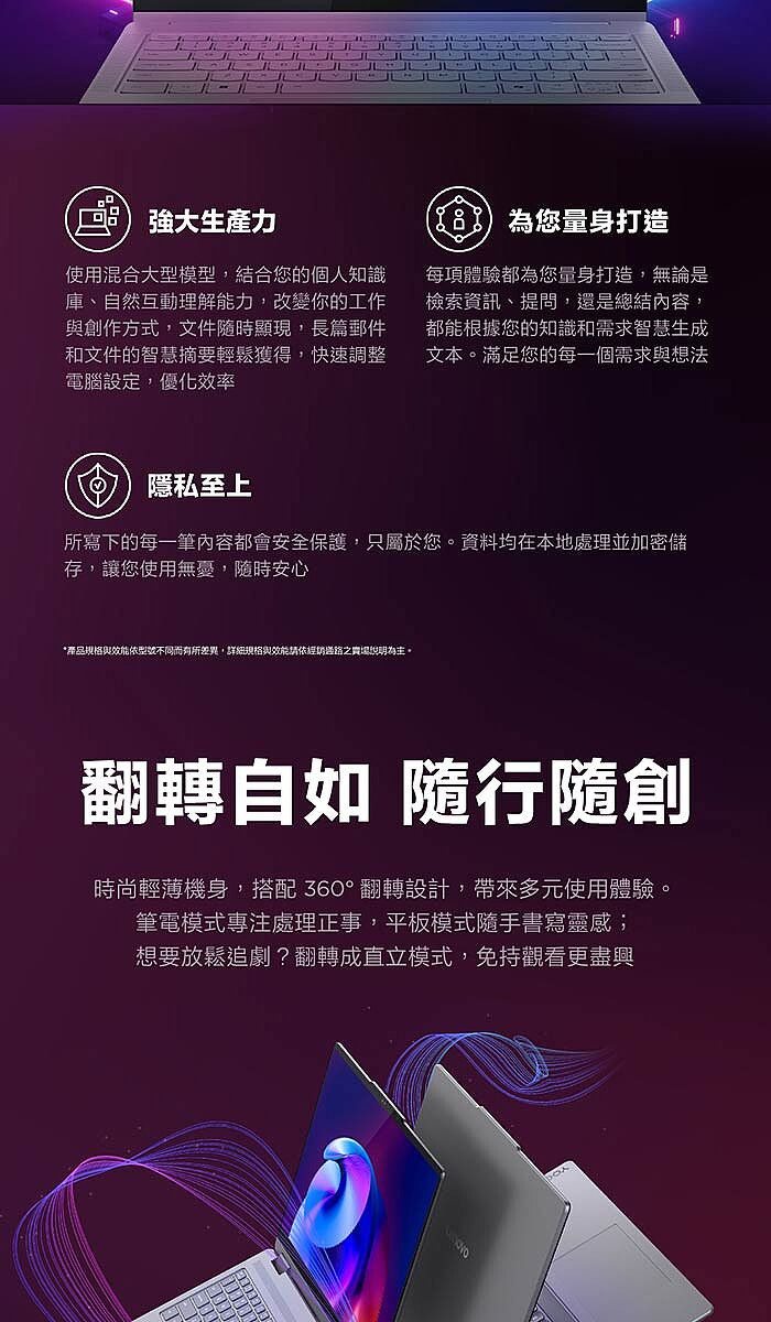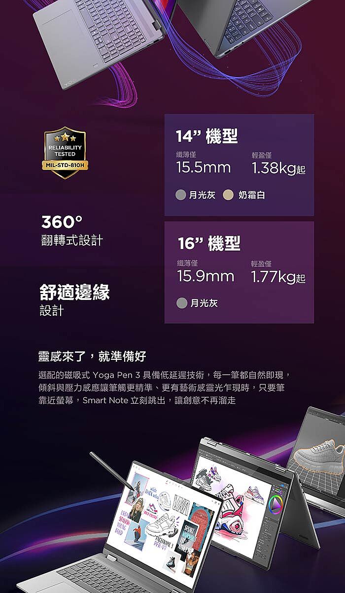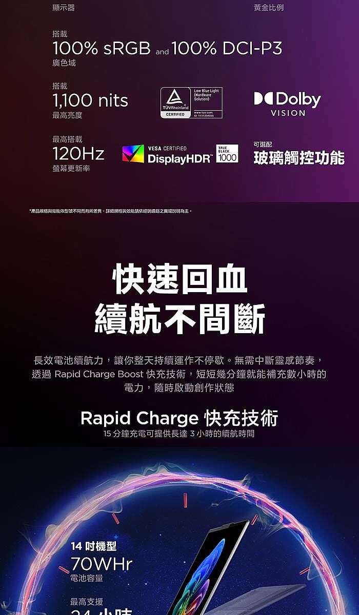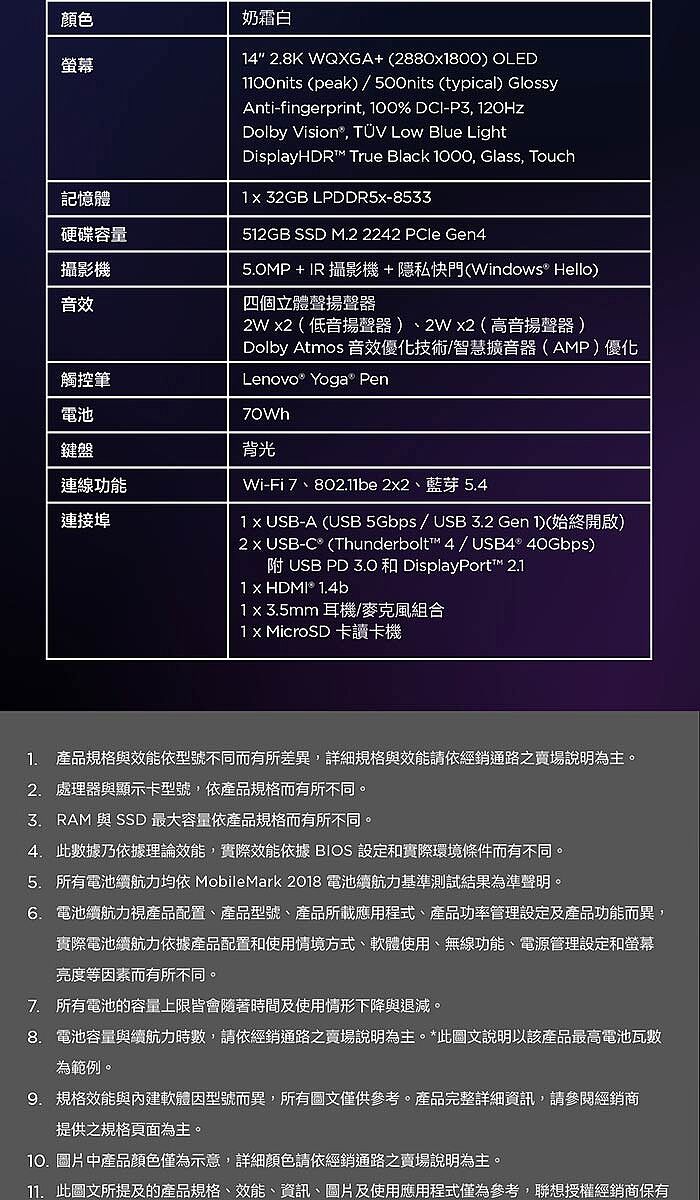 ●螢幕:14" 2.8K WQXGA+ (2880x1800) OLED 1100nits (peak) / 500nits (typical) Glossy / Anti-fingerprint, 100% DCI-P3, 120Hz, Dolby Vision®, TÜV Low Blue Light, DisplayHDR™ True Black 1000, Glass, Touch