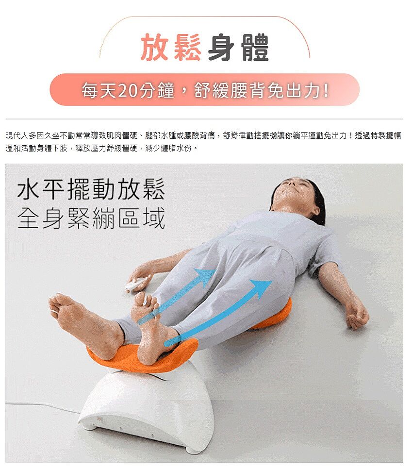 宅運動新革命!躺著就能動,懶出新境界!日本運動科學博士石川昌紀教授專業推薦,每天 20 分鐘,躺平運動免出力!安全又溫和,零負擔、低衝擊不傷關節,抬腿搖擺甩動全身,舒緩僵硬並甩開緊繃。每天搖一搖,越動越有勁,坐躺兩用,遙控調速更方便!