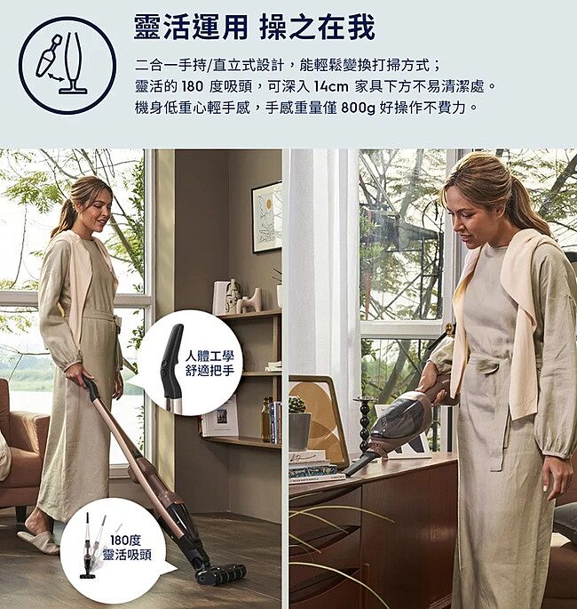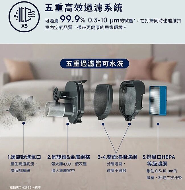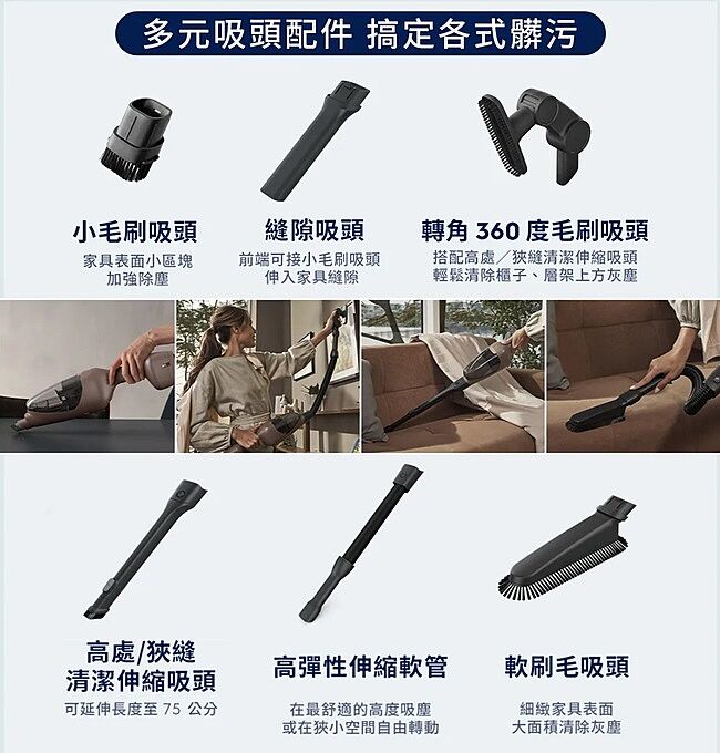 獨家專利毛髮截斷功能 可水洗HEPA等級過濾濾網 手持直立二合一設計