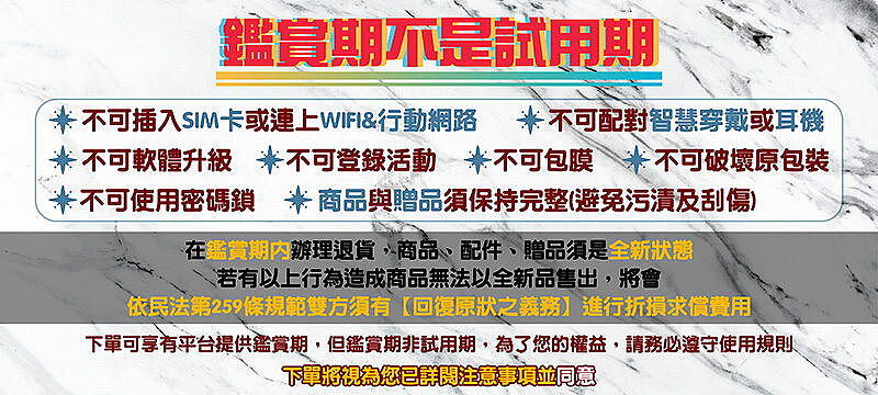※行動商品連結網路即會回傳序號至原廠伺服器即完成開通保固,開通日即是保固起始日,商品退貨若經查詢已開通保固或註冊登錄原廠活動,則是減損新品價值,本公司將會依民法第259條規範雙方須有【回復原狀之義務】進行新品價值折損之整新費用。