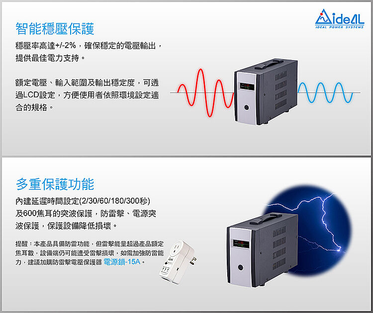 ◆ 具有穩壓、過載、雷擊突波保護功能