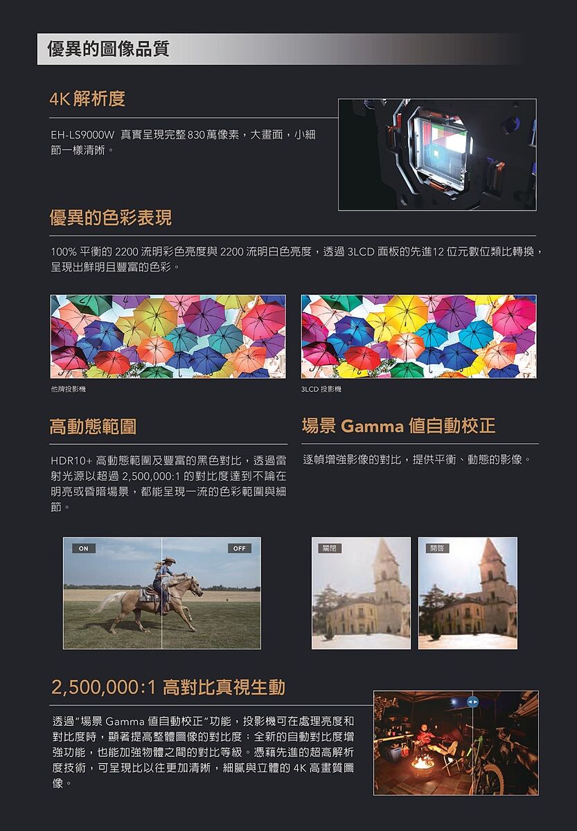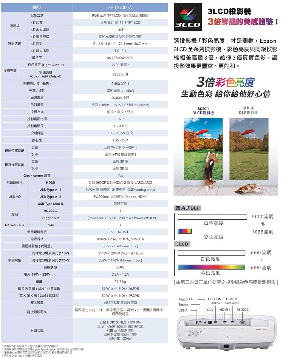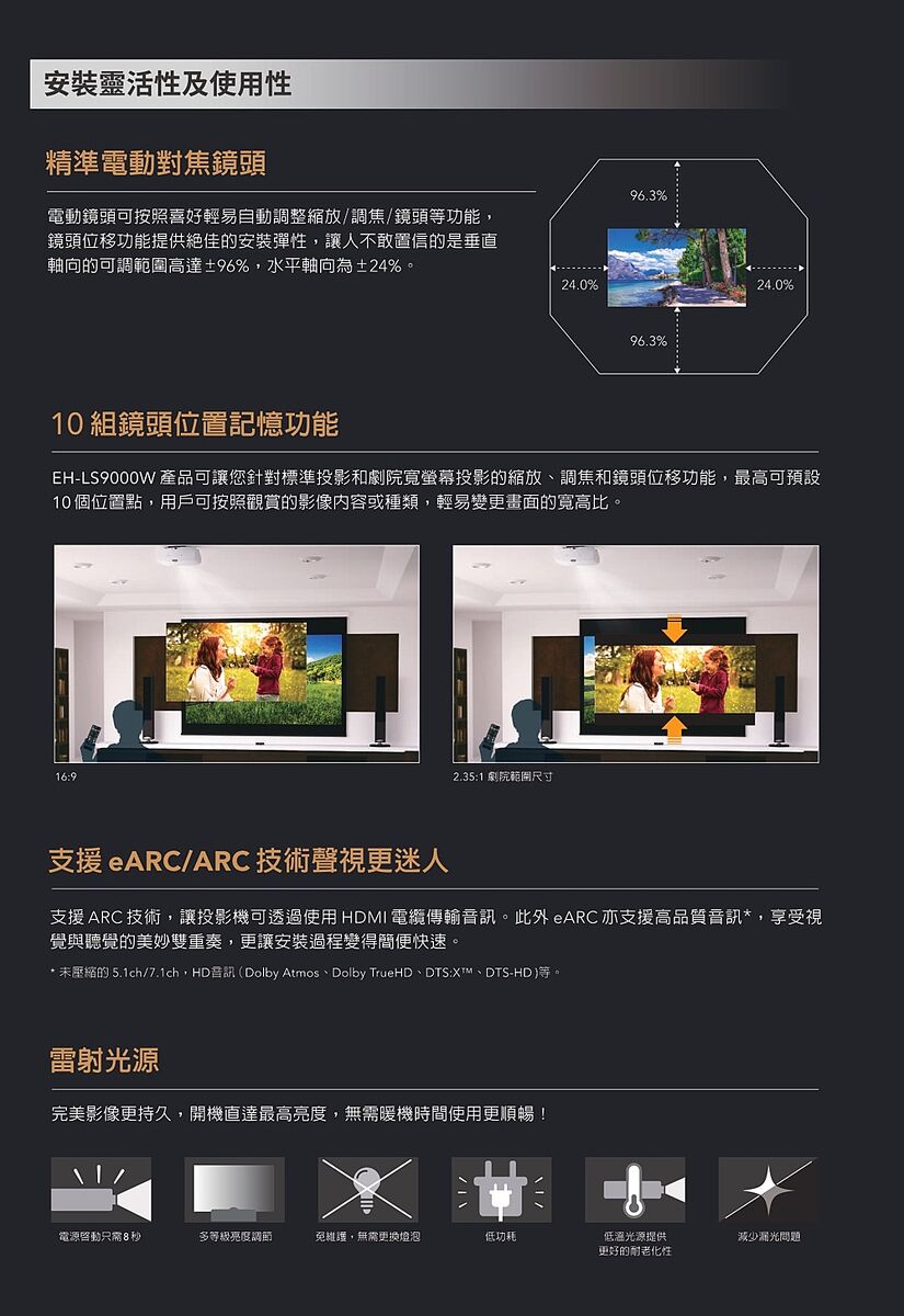 Epson專業家庭劇院機EH-LS9000W,以極致4K 解析度、更廣的HDR表現、優異雷射光源和 Epson 3LCD 色彩技術,並繼承大範圍的鏡頭位移血統,讓家庭劇院輕鬆升級,在家就能享受大畫面的震撼影像。