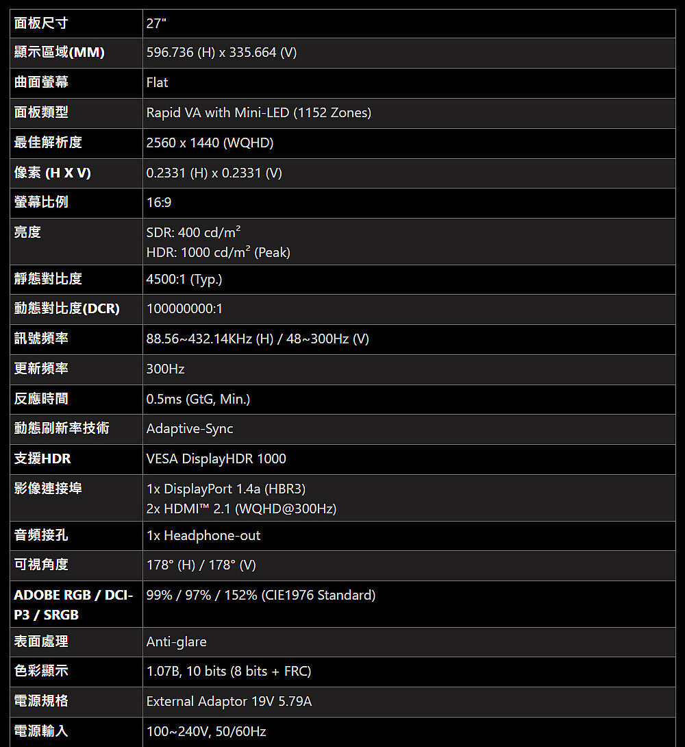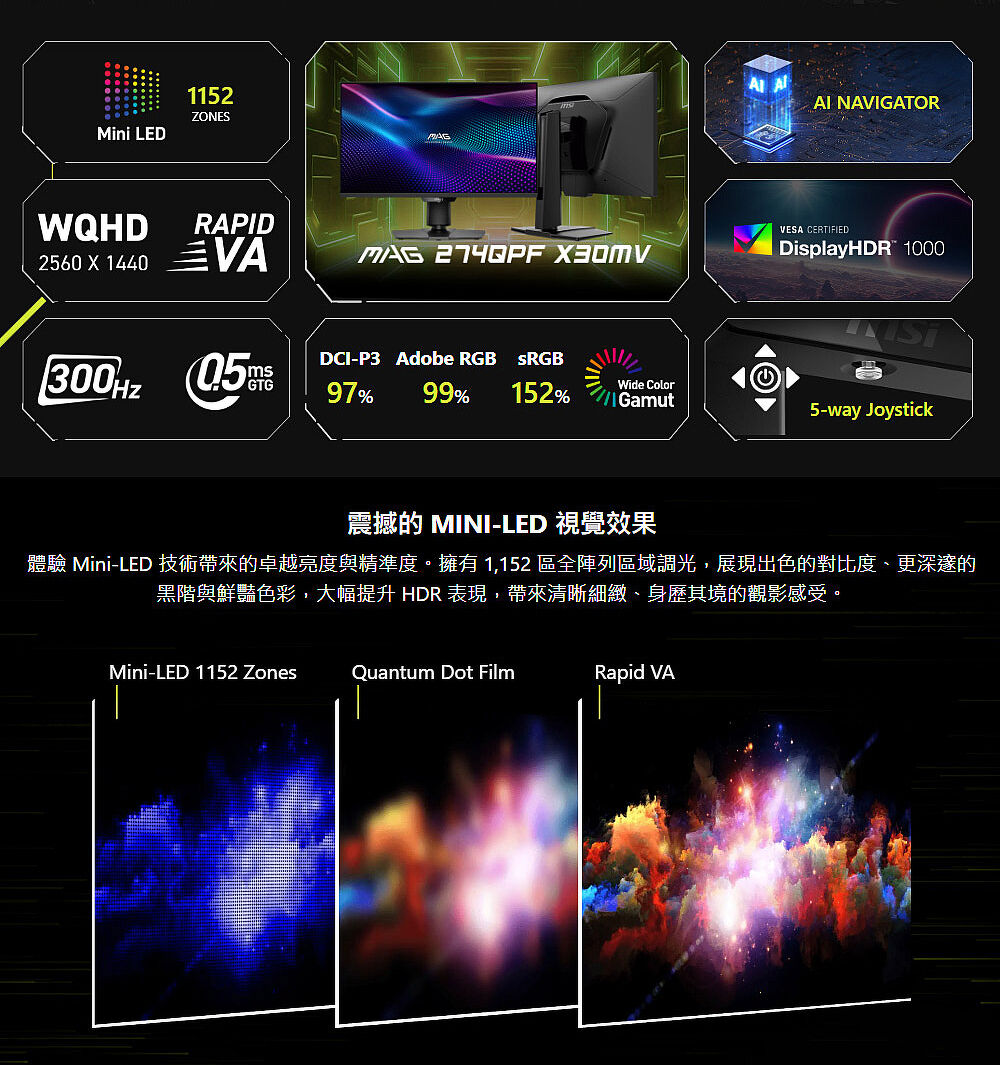 Mini-LED–採用全陣列區域控光技術,擁有1,152個分區,提升HDR表現,實現更深邃黑階與更明亮高光色彩
