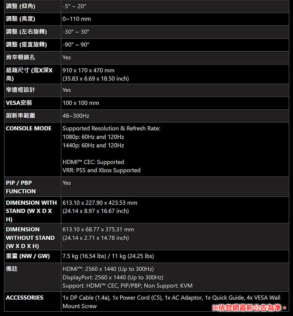 ※以上規格資料若有任何錯誤或原廠更動,以原廠所公佈資料為準。
