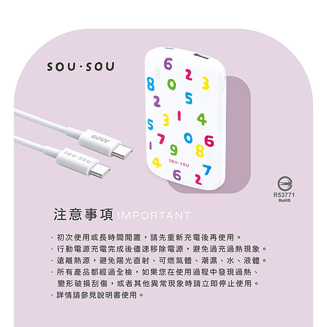 SOU.SOU十數昆 超薄Type C 雙輸出行動電源 + 60W C to C 快充傳輸線