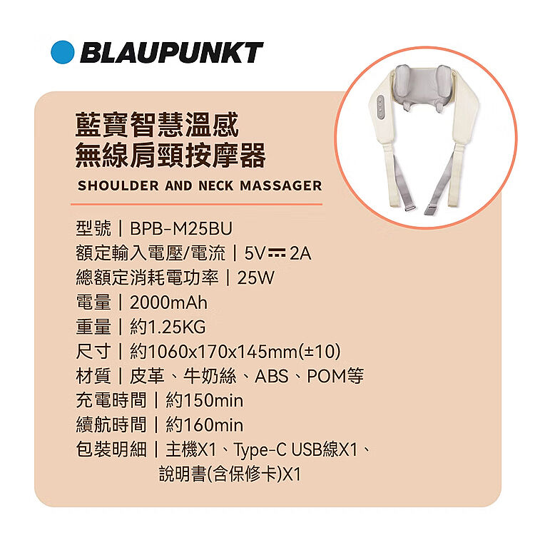 【BLAUPUNKT 德國藍寶】智慧溫感無線肩頸按摩器(BPB-M25BU)