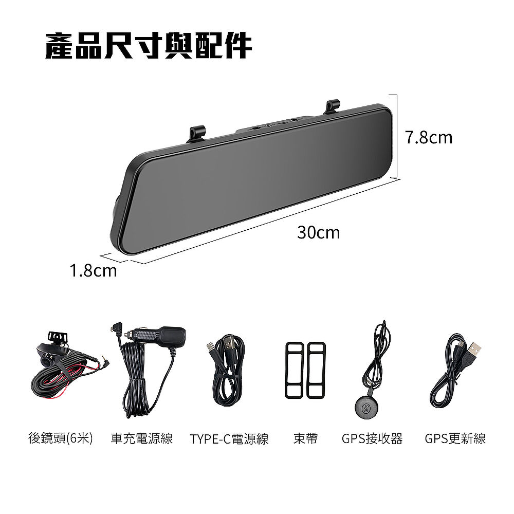 配件:主機/專用2K後鏡頭/6m後鏡頭延長線/3.5m車充(TYPE-C)/GPS接收器(延長線)/GPS更新線/TYPE-C線/橡皮綁帶/說明書(保卡)
