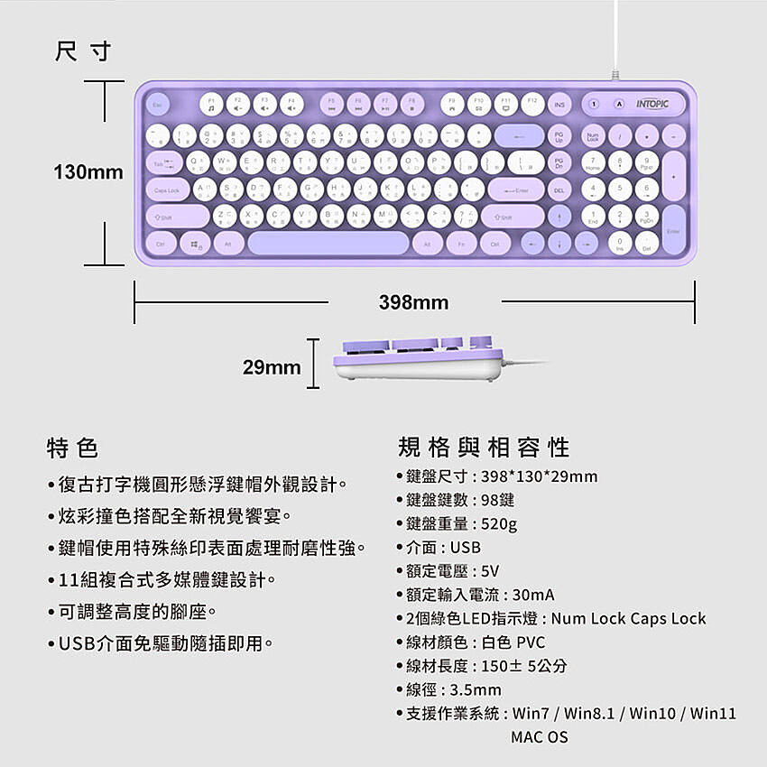 鍵盤尺寸:398(L) x 130(W) x 29(H)mm