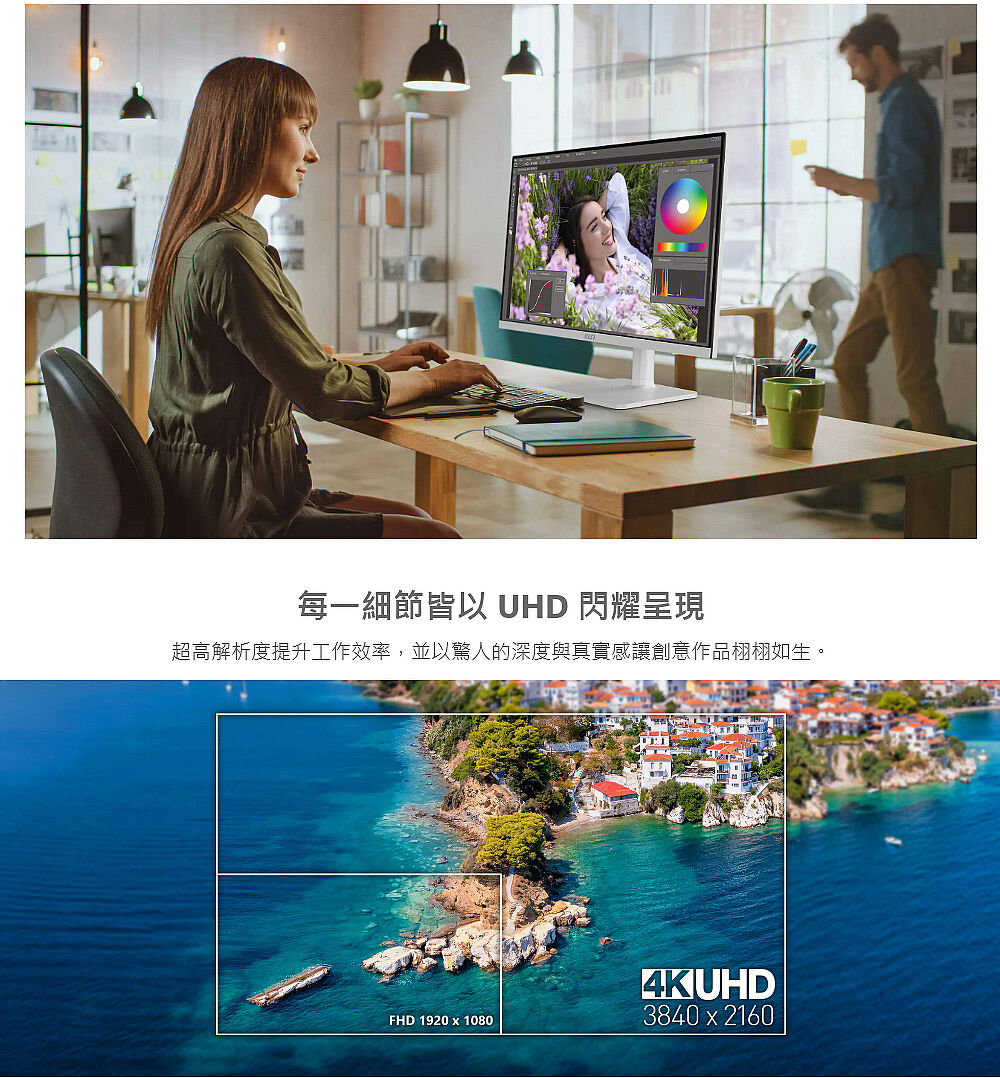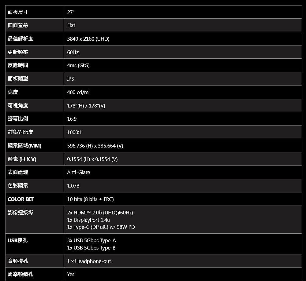27 吋 4K UHD 顯示器 (3840 x 2160 / 16:9),專為商務專業人士、多工處理及創作者設計