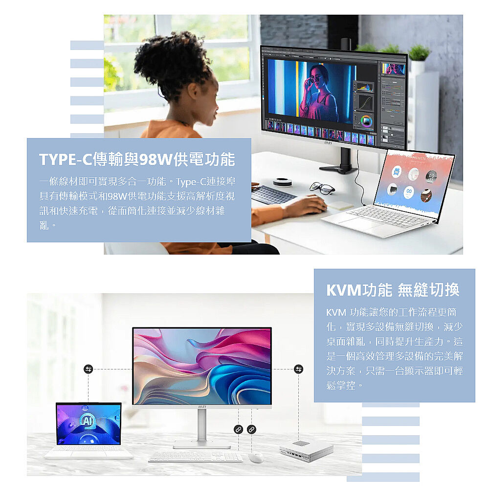 KVM 功能讓您可在多設備間切換,並使用一組鍵盤和滑鼠進行操作