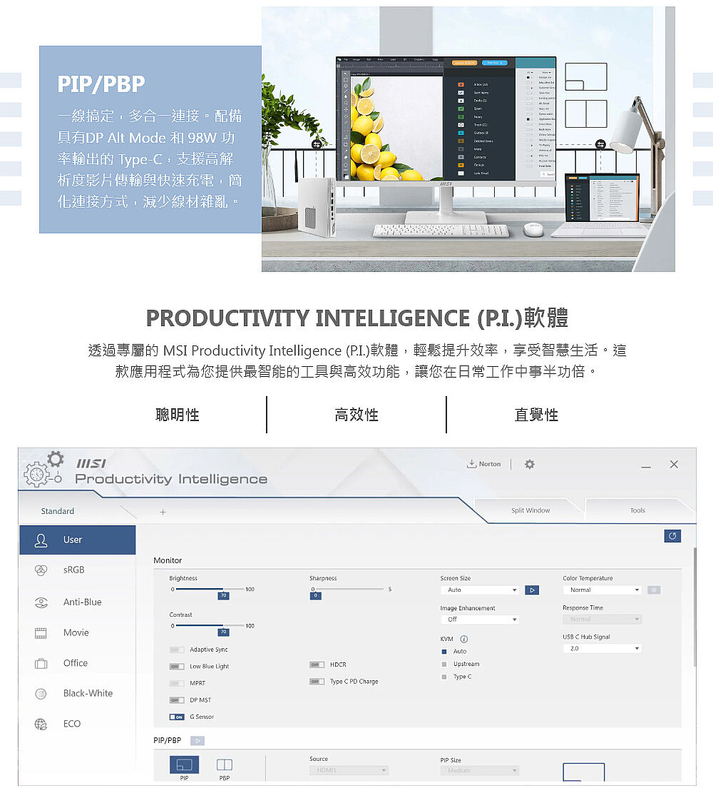 多種輸入裝置(Type-C、HDMI™、DP),滿足不同裝置需求