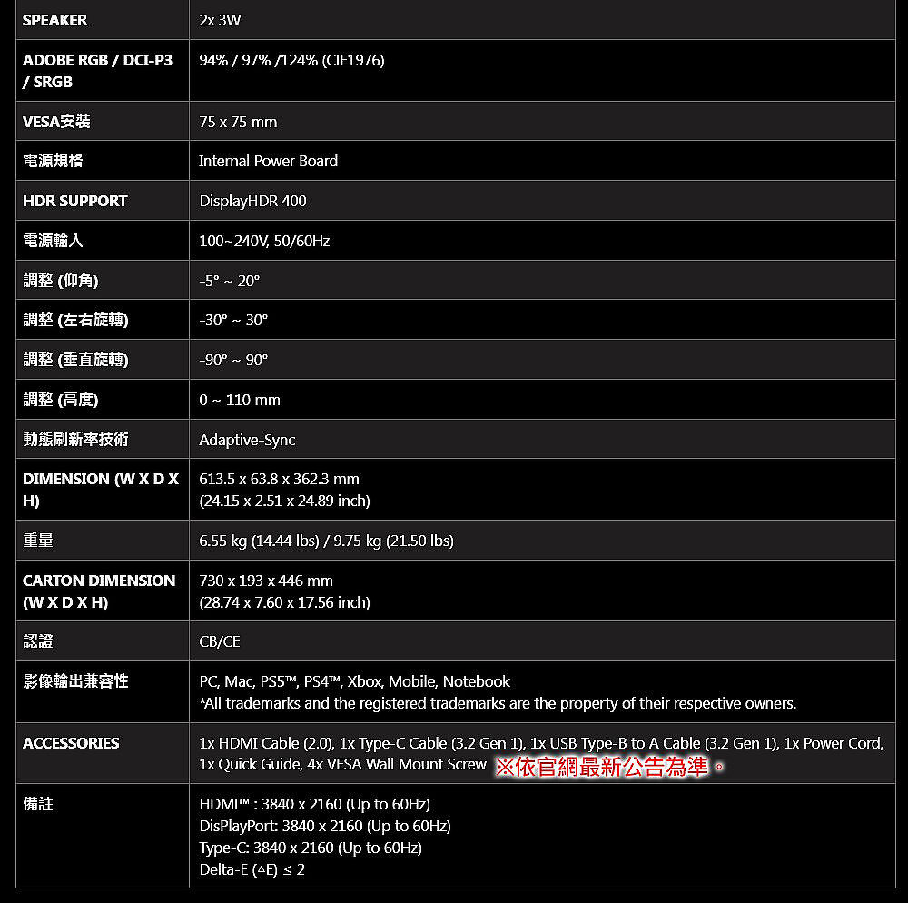 ※以上規格資料若有任何錯誤或原廠更動,以原廠所公佈資料為準。